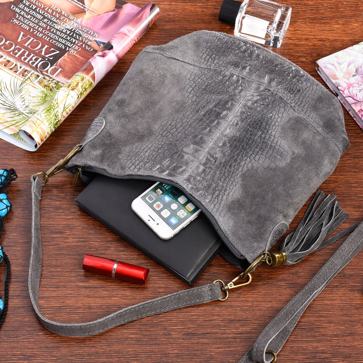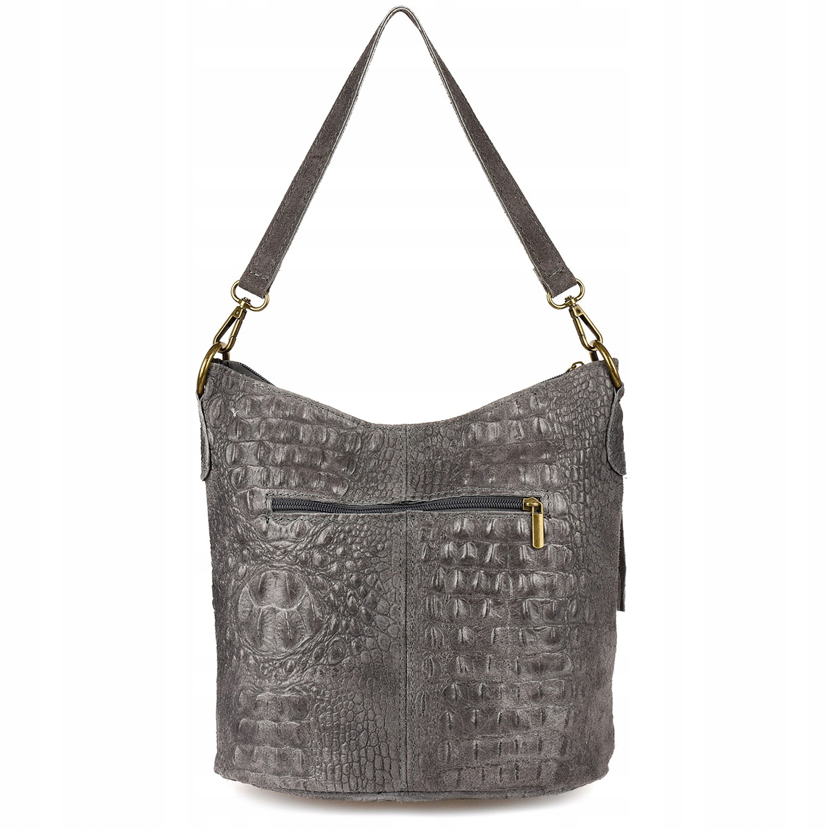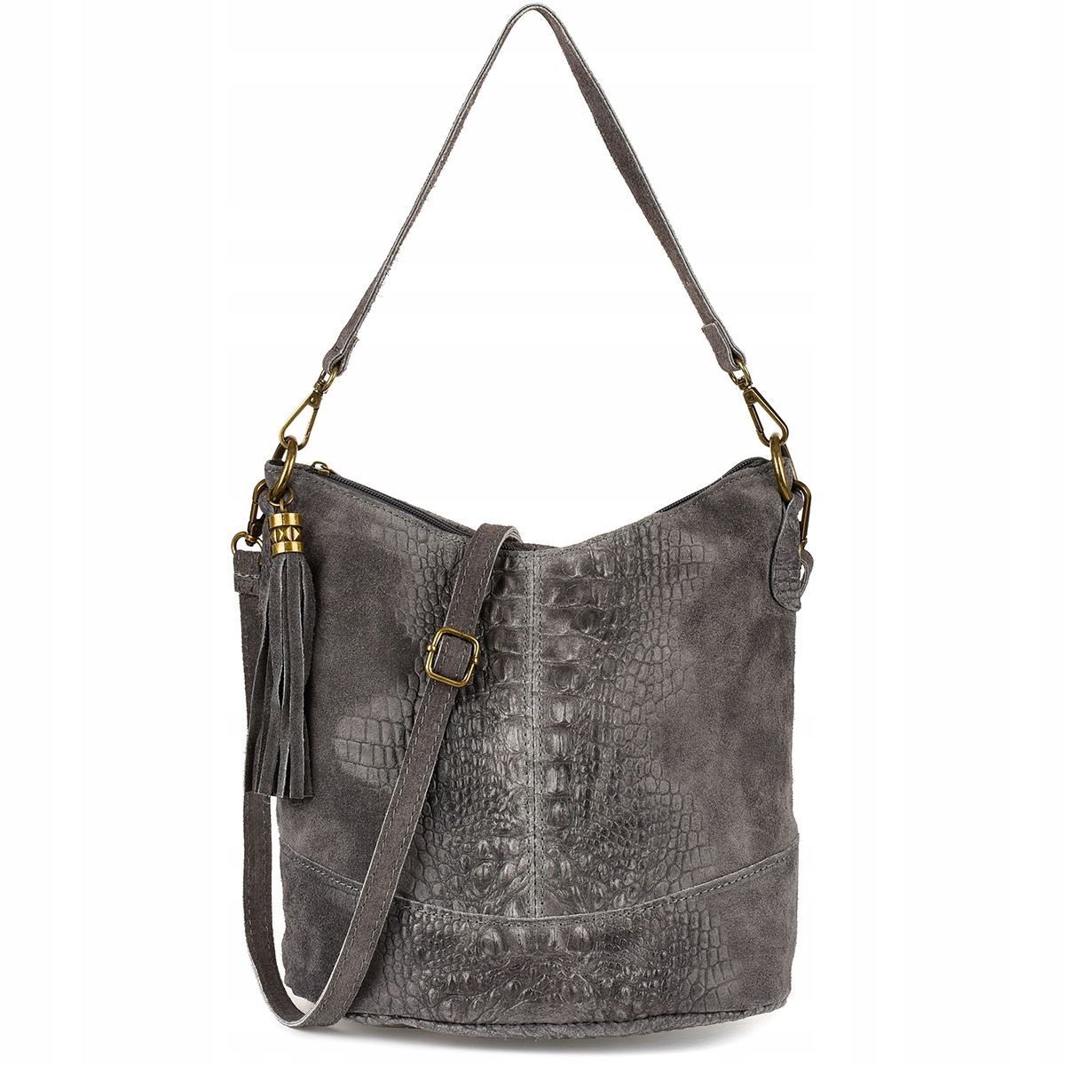 - Modną ozdobę stanowi również długi, zamszowy frędzel, będący brelokiem bocznej kieszonki torby